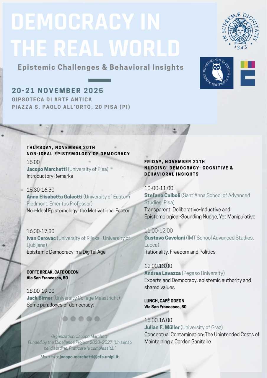 20 e 21 novembre convegno ” Democracy in the real world” Gipsoteca di Arte Antica 20 Novembre 2025 - 21 Novembre 2025