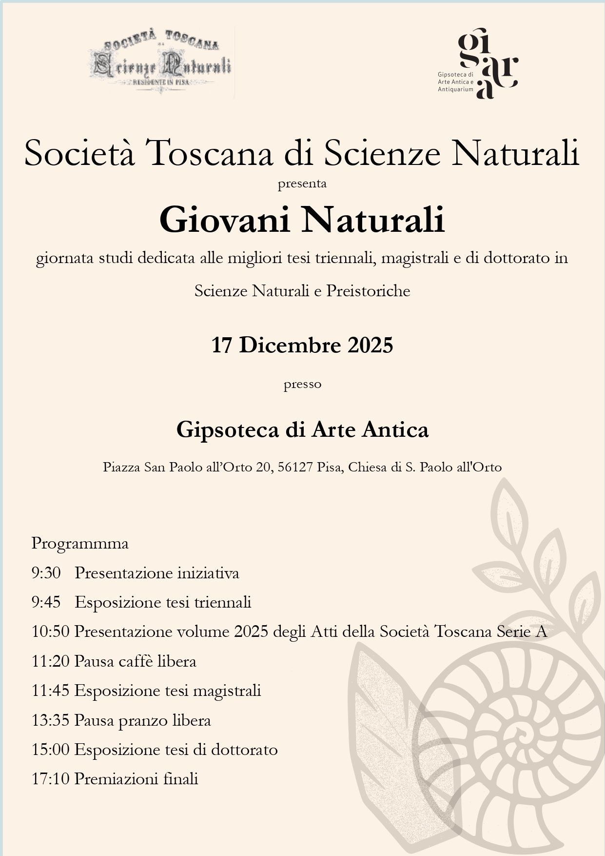 Il giorno 17 Dicembre 2025, dalle ore 9:30, presso la Gipsoteca di Arte Antica si terrà la premiazione delle migliori tesi triennali, magistrali e di Dottorato selezionate nell’ambito del premio Giovani Naturali 2025, istituito dalla Società Toscana di Scienze Naturali.
